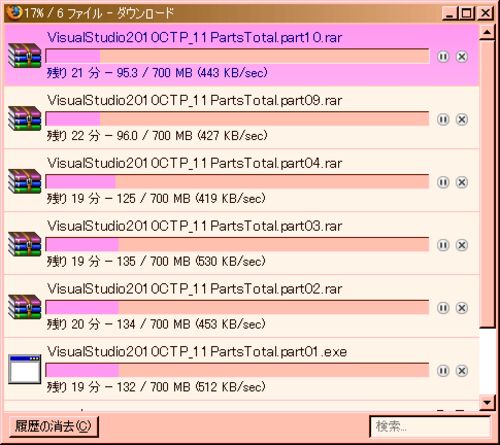 キャプチャ時の風速 5,417KB/s! (43.336Mbit/s!) タスクマネージャで見ても、合計・平均で 50Mbit/s ぐらいなので、やっぱりそれぐらい出ていたのでしょう…! というわけで、昨日は Visual Stduio 2010 の評価版を落としてみました。本当に些細な思いつきで…